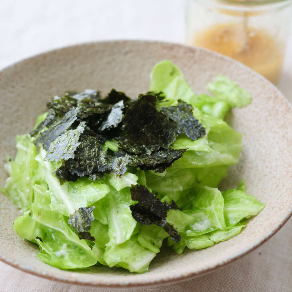 ⚫︎キャベツの葉2枚程度をちぎり、やみつき塩麹ドレッシング大さじ1と、手でギュッと潰しながら混ぜて、お好みで千切のりをかけてナムルに。